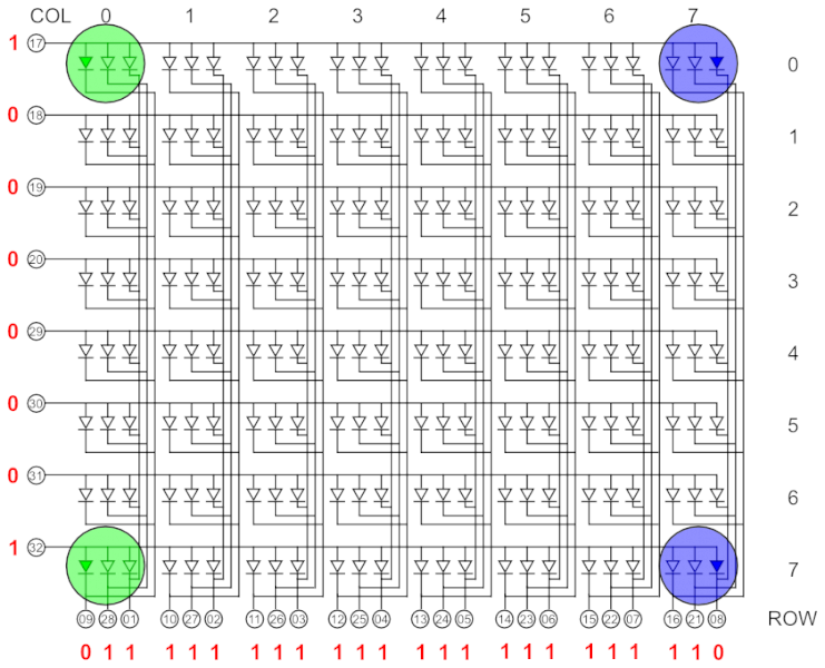 Comme indiqué dans le schéma ci-dessous, les LED sont reliées entre elles ("multiplexées") de façon à réduire le nombre de broches de la matrice à 32 :