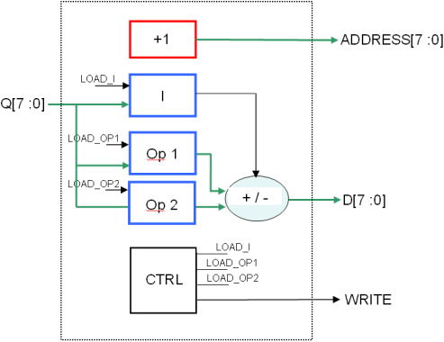 Remarque : on peut se dire que ce n’est pas la peine de stocker cet opérande, car on dispose dès à présent de toutes les données pour effectuer le calcul : l’instruction dans un registre, l’opérande dans un autre registre, et le deuxième opérande sur le bus Q[7:0]. Mais il faudrait alors stocker le résultat dans un registre 8 bits, car on ne fait son stockage en RAM qu’au prochain cycle…Alors qu’ici, le calcul et le stockage seront faits en bloc au prochain cycle (donc pas besoin de stocker le résultat dans un registre). Au total, dans les deux approches, le nombre de registres est le même, et ce ne sont que des considérations de chemin critique qui permettront de déterminer la meilleure des deux méthodes…