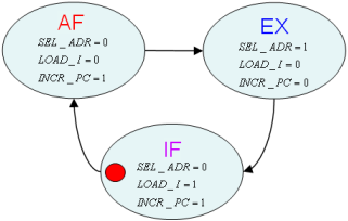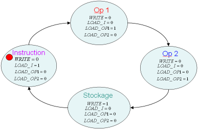 Remarque : Les signaux générés par l'automate ne dépendent pas seulement de l’état courant de l'automate, mais aussi de la nature de l’instruction à exécuter. On nomme ce genre d'automate "machine de Mealy")