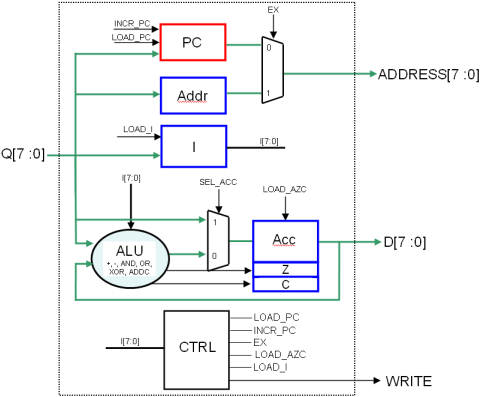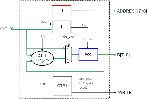 Remarque : le signal SEL_ACC ne sort pas de CTRL sur le schéma : il peut être inclus, avec le multiplexeur qu’il pilote, dans l’ALU...
