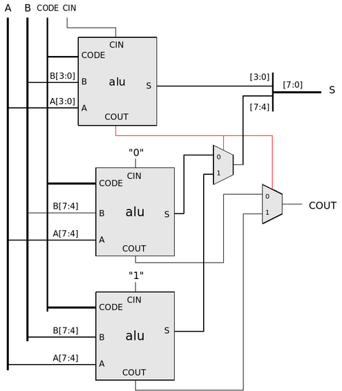 Le shéma suivant représente une variante d'additionneur 8bits utilisant votre ALU 4 bits (celle du paragraphe 4.2)