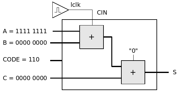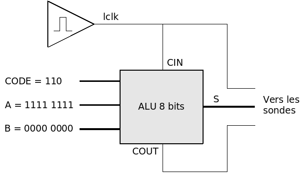 Pour mesurer les temps de calcul en mode additionneur de votre ALU 8bits, nous avons préparé une configuration où le code est forcé à la valeur correspondant à l'addition: