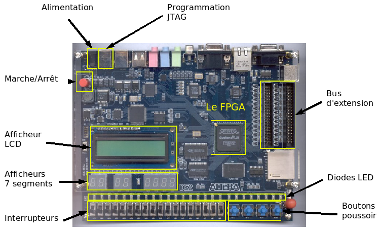 Une photo de la maquette apparaît ci-dessous. Vous pouvez retrouver le FPGA, les E/S , le connecteur d'alimentation, le connecteur de programmation (via votre PC), ainsi que les connecteurs d'extension. Ces derniers permettront de connecter les sondes d'un analyseur logique de manière à observer les signaux sortants du FPGA.
