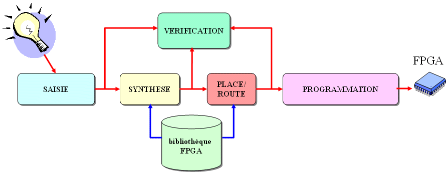 Les logiciels de CAO électronique aident le concepteur dans toutes les étapes du flot de conception d'un circuit. Les principales étapes pour un FPGA sont :