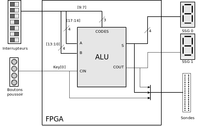 Pour le moment, nous n'avons fait que des simulations, il reste à intégrer réellement votre ALU dans la maquette. La figure suivante décrit l'interface simplifiée entre votre ALU et les éléments de la maquette. Cette interface existe et vous n'avez pas à la réaliser.