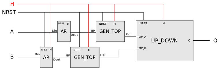 - Un bloc UP_DOWN qui reçoit les signaux TOP_A et TOP_B. Lorque TOP_A est reçu par ce bloc, le compteur interne est incrémenté, alors que TOP_B provoque la décrémentation. Lorsque les 2 TOPs sont reçus ensemble (en même temps), le fonctionnement n'est pas spécifié et donc le concepteur a le choix de l'opération (incrémentation ou décrémentation ou rien).