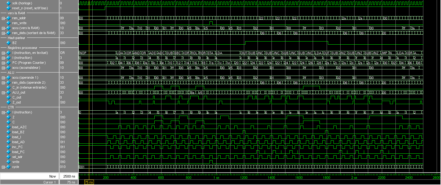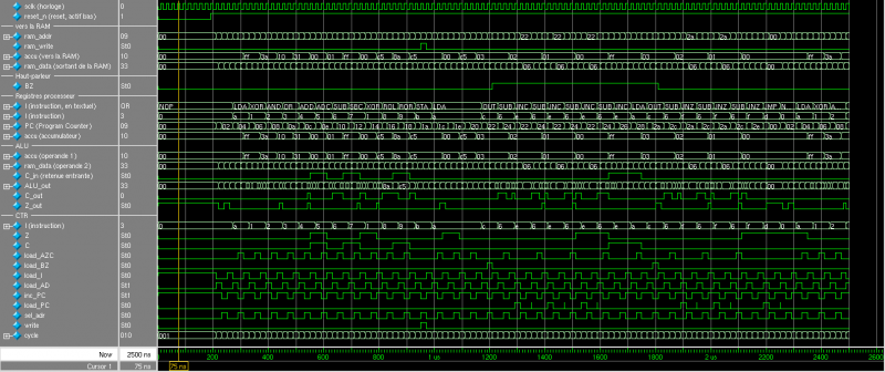 Pour suivre les chronogrammes, il est conseillé de se rapporter à la page du programme de test, et de suivre le déroulement du programme cycle par cycle.