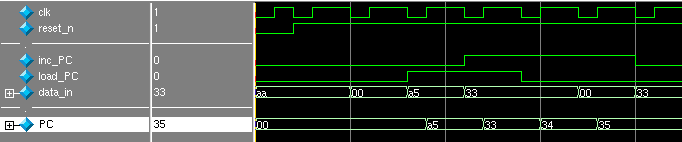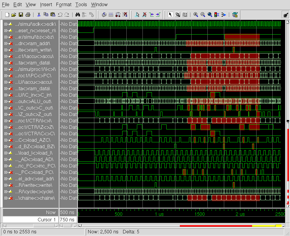 • Après un certain temps, le simulateur doit vous afficher : "le bloc PC fonctionne", et la fenêtre des chronogrammes doit avoir la même tête que la figure 5.