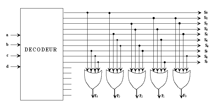 Un décodeur 4 bits peut fournir les termes Si, comme vu dans l'exercice précédent, A l'aide de ces termes (qui sont les sorties du décodeur) et par analyse de la table de vérité, on obtient :