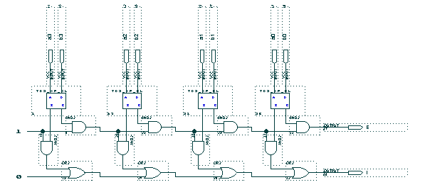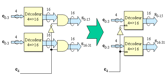 2 décodeurs 4 vers 16 peuvent être pilotés par les 4 bits de faibles poids de l'entrée (e0-3). Le bit de fort poids e4 sert à autoriser les sorties de l'un des 2 décodeur. Un décodeur 1 bit composé d'un simple inverseur est utilisé pour piloter les sorties. Quand e4 est à 0 , les sorties du décodeur de faible poids sont autorisées à sortir par le biais de porte ET; quand e4 est à 1 , ces sont les sorties du décodeur de fort poids qui sont autorisées. Si les décodeur ont une entrée de validation "en" , Il suffit d'utiliser ce décodeur 1 bit sur les entrées "en" des 2 décodeurs comme le montre la figure 3.1.