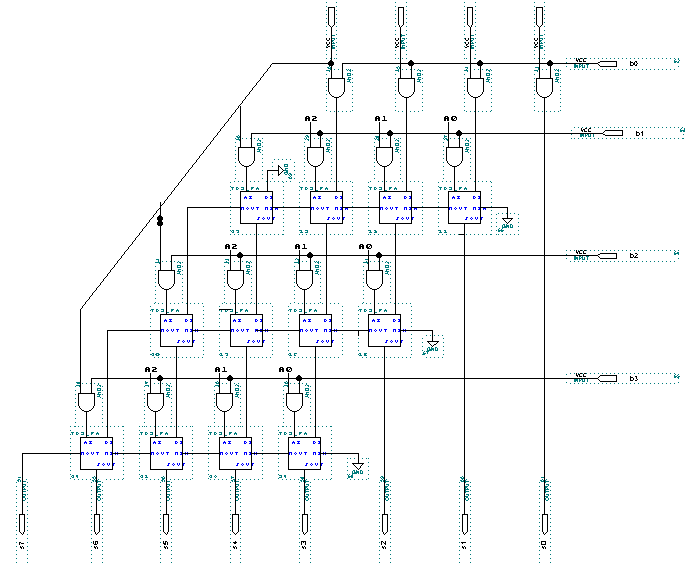 Question Proposer le schéma d'un multiplieur de 2 nombres positifs de 4 bits. On dispose pour cela d'additionneurs 4 bits.