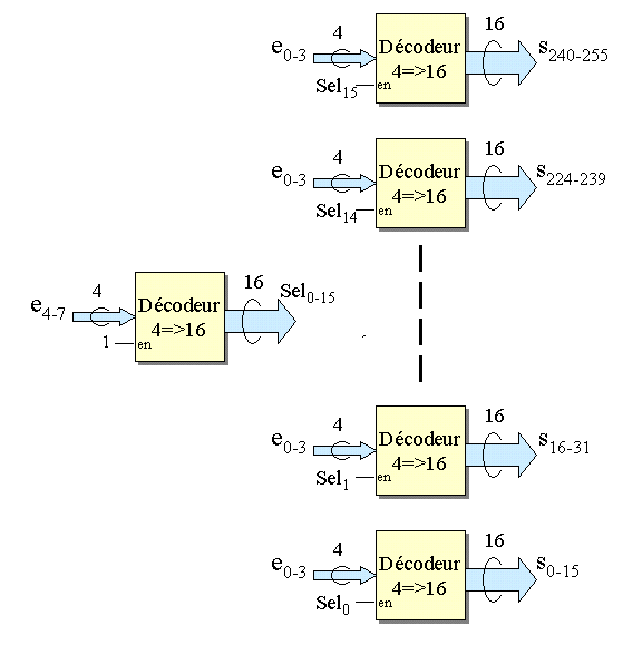 Dans ce cas un décodeur 4 vers 16 sur les bits de forts poids de l'entrée peut générer 16 sorties de sélection "Sel". Ces sorties sont reliées aux entrées "en" de 16 décodeurs 4 bits de faibles poids de façon à en autoriser 1 parmi 16. Il faut donc un total de 17 décodeurs comme le montre la figure 3.2.