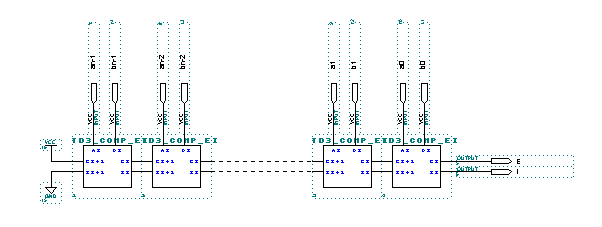 2. Les produits partiels étant maintenant des nombres signés, il est nécessaire avant de réaliser leur addition de pratiquer des extensions de signe. Ces extensions sont simplement réalisées par cablage. On voit cependant, que la taille des produits partiels augmentant, la taille des additionneurs augmente également.