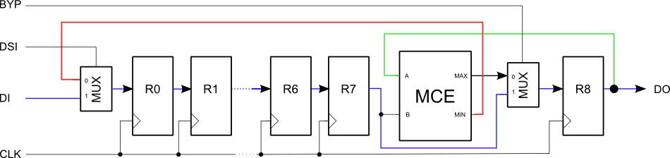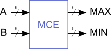 Le module MCE est entièrement combinatoire. Il compare les deux pixels d'entrée A et B puis dépose le plus grand sur sa sortie MAX et le plus petit sur sa sortie MIN.