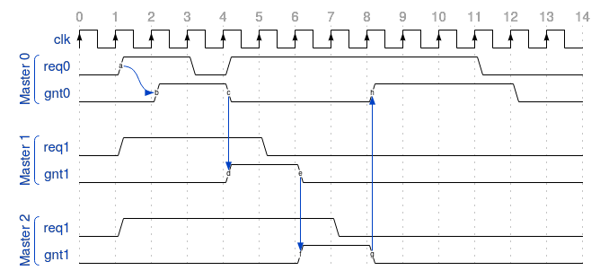 La figure montre un exemple de fonctionnement de l'arbitre. A partir du cycle 1, les trois masters font des requêtes simultanées. La première requête est acquise au cycle 2. Le deuxième et troisième master obtiennent la main dans les cycles 4 et 6. Noter que le premier master, après avoir laché sa requête (cycle 3), demande la main directement après (cycle 4). Mais, suivant le protocol "round robin", c'est le troisième master qui est servi d'abord.