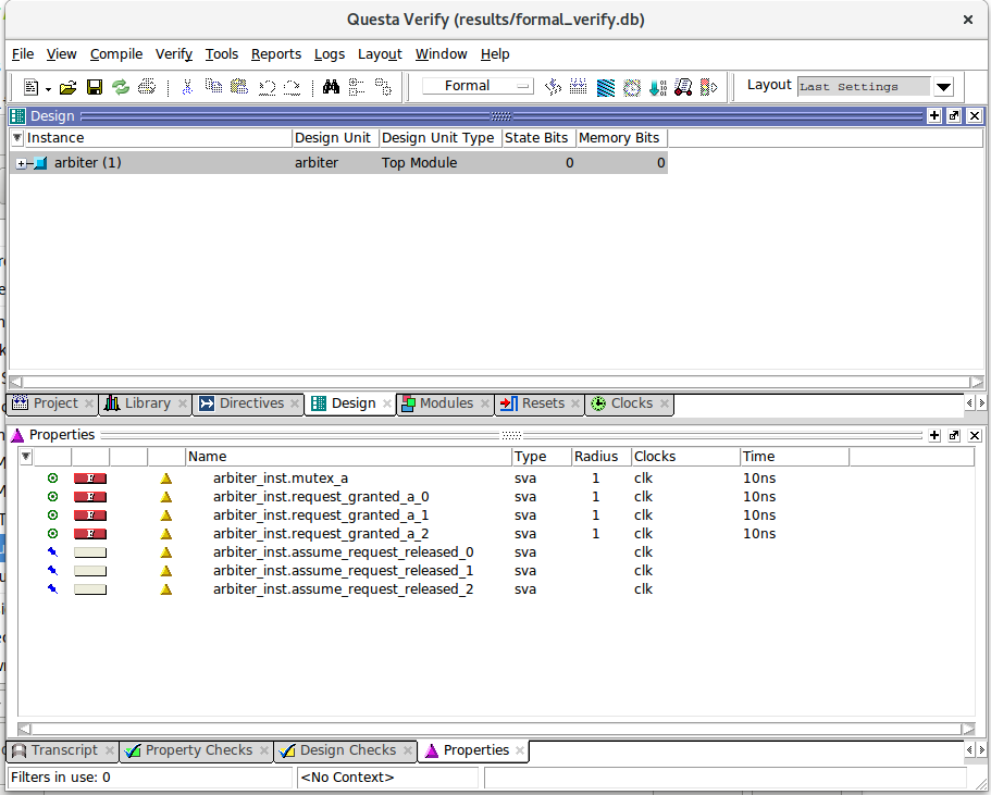 Néanmoins, vous pouvez aussi lancer le processus de de vérification. Cela peut servir à effectuer un contrôle de la syntaxe de vos propriétés SVA. Pour cela, allez dans le dossier verif de votre projet et tapez